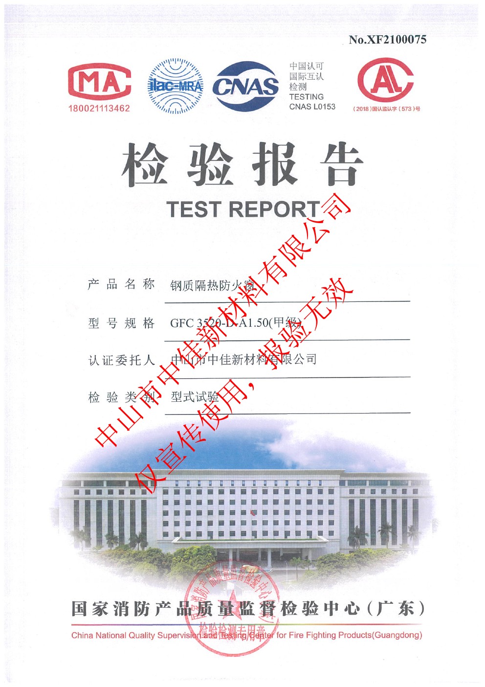 中佳防火玻璃再獲新突破,通過甲乙級固定防火窗檢測報告
